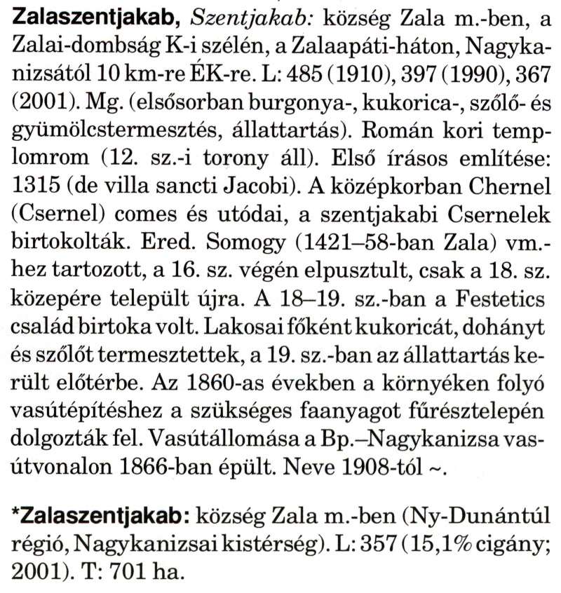 Nyilvános 1938 | 5441 | A szócikkek felismertetett szövege: | (A csillag után a kiegészítő kötetből származó szöveg következik) Zalaszentjakab, Szentjakab: község Zala m.-ben, a Zalai-dombság K-i szélén, a Zalaapáti-háton, Nagykanizsától 10 km-re ÉK-re. L: 485 (1910), 397 (1990), 367 (2001). Mg. (elsősorban burgonya-, kukorica-, szőlő- és gyümölcstermesztés, állattartás). Román kori templomrom (12. sz.-i torony áll). Első írásos említése: 1315 (de villa sancti Jacobi). A középkorban Chernel (Csernel) comes és utódai, a szentjakabi Csernelek birtokolták. Ered. Somogy (1421-58-ban Zala) vm.-hez tartozott, a 16. sz. végén elpusztult, csak a 18. sz. közepére települt újra. A 18—19. sz.-ban a Festetics család birtoka volt. Lakosai főként kukoricát, dohányt és szőlőt termesztettek, a 19. sz.-ban az állattartás került előtérbe. Az 1860-as években a környéken folyó vasútépítéshez a szükséges faanyagot fűrésztelepén dolgozták fel. Vasútállomása a Bp.-Nagykanizsa vasútvonalon 1866-ban épült. Neve 1908-tól ~. *Zalaszentjakab: község Zala m.-ben (Ny-Dunántúl régió, Nagykanizsai kistérség). L: 357 (15,1% cigány; 2001). T: 701 ha. A szócikkek a következő lexikonból származnak: Cím: Magyar nagylexikon Közreműködő: Élesztős László (1949) (szerk.) ; Barabás Éva (1943) (szerk.) ; Berényi Gábor (1946) (szerk.) ; Bárány Lászlóné (szerk.) ; Adelmann-né Kertész Judit (1945) (közrem.) ; Froemel Károlyné Jáky Éva (1936) (közrem.) ; Akadémiai Kiadó és Nyomda Vállala Szerz. közl.: [... Élesztős László főszerk.] ; [szerk. Barabás Éva et al.] ; [bibliogr. Adelmanné Kertész Judit] ; [kész. az Akadémiai Kiadó Magyar Nagylexikon Szerkesztőségében] Kiadás: Budapest : Akad. K., 1993- Kötetei: 1. köt., A - Anc 2. köt., And - Bag 3. köt., Bah - Bij 4. köt., Bik - Bz 5. köt., C - Csem 6. köt., Csen - Ec 7. köt., Ed - Fe 8. köt., Ff - Gyep 9. köt., Gyer - Iq 10. köt., Ir - Kip 11. köt., Kir - Lem 12. köt., Len - Mep 13. köt., Mer - Nyk 14. köt., Nyl - Pom 15. köt., Pon - Sek 16. köt., Sel - Szö 17. köt., Szp - Ung 18. köt., Unh - Z 19. köt., Kiegészítő kötet, A - Z ETO jelzet: 030=945.11 Szakjelzet: 030 Cutter: M 14 ISBN: 963-05-6611-7 [!ISBN 963-05-6615-X] Nyelv: magyar Megjegyzés: Az 5. kötettől kiad. a Magyar Nagylexikon Kiadó ; A 6. kötettől főszerk. Berényi Gábor ; A 6. kötettől szakszerk. Bárány Lászlóné et al. ; A 6. kötettől bibliogr. Froemel Károlyné ; Bibliogr. a szócikkek végén |