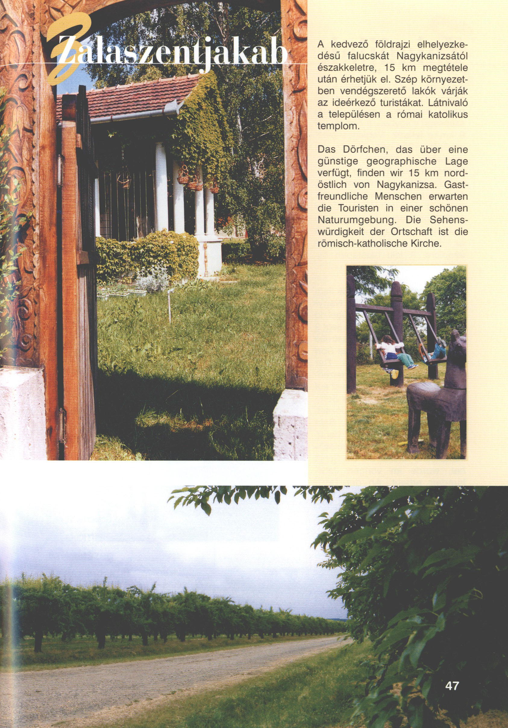 Nyilvános 1958 | 6455 | Zalaszentjakab | Das Dörfchen, das über eine günstige geographische Lage verfügt, finden wir 15 km nordöstlich von Nagykanizsa. Gastfreundliche Menschen erwarten die Touristen in einer schönen Naturumgebung. Die Sehenswürdigkeit der Ortschaft ist die römisch-katholische Kirche. Dieses Text stammt von: Titel: Hívogató a Régiók Kapujában - Útikönyv Látnivalók Nagykanizsán és Térségében (Einladend in dem Tor des Gebiets - Reisebuch - Sehenswürdigkeiten in Nagykanizsa und Umgebung) Herausgegeben von: Nagykanizsa és a Környező Települések Területfejlesztési Társulása (Verein für Gebietsentwicklung in Nagykanizsa und in ihrer Umgebung) 8800 Nagykanizsa, Petőfi Sándor út 5. Tel.: 06 93/536-453 • 06 93/536-454 Tel ./Fax: 06 93/326-323 E-mail: terstars@axelero.hu www.kanizsaterseg.celodin.hu |