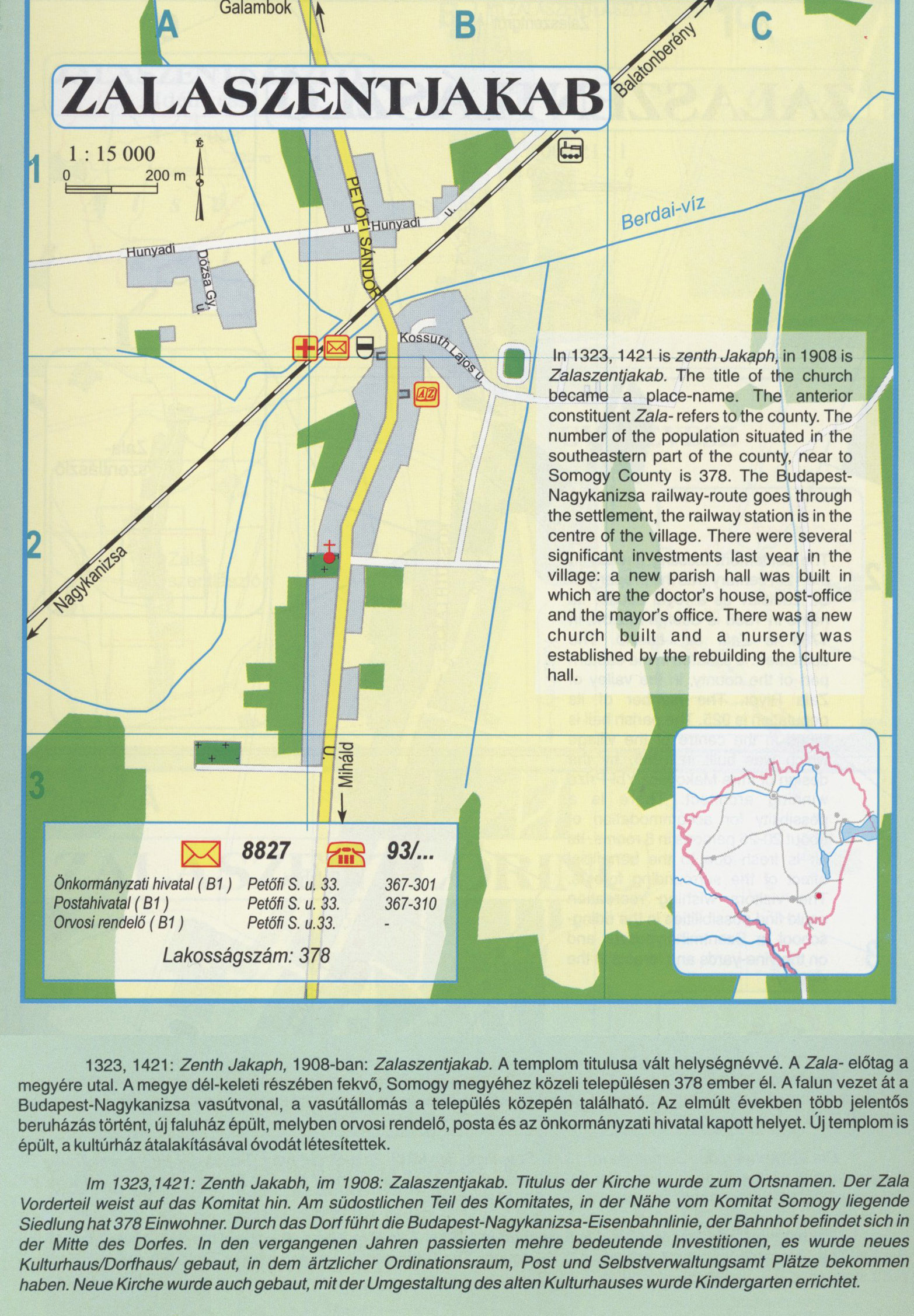 Nyilvános 1969 | 6710 | ZALASZENTJAKAB | 1323, 1421: Zenth Jakaph, 1908-ban: Zalaszentjakab. A templom titulusa vált helységnévvé. A Zala- előtag a megyére utal. A megye dél-keleti részében fekvő, Somogy megyéhez közeli településen 378 ember él. A falun vezet át a Budapest-Nagykanizsa vasútvonal, a vasútállomás a település közepén található. Az elmúlt években több jelentős beruházás történt, új faluház épült, melyben orvosi rendelő, posta és az önkormányzati hivatal kapott helyet. Új templom is épült, a kultúrház átalakításával óvodát létesítettek. lm 1323,1421: Zenth Jakabh, im 1908: Zalaszentjakab. Titulus der Kirche wurde zum Ortsnamen. Der Zala Vorderteil weist auf das Komitat hin. Am südostlichen Teil des Komitates, in der Nähe vom Komitat Somogy liegende Siedlung hat 378 Einwohner. Durch das Dorf führt die Budapest-Nagykanizsa-Eisenbahnlinie, der Bahnhof befindet sich in der Mitte des Dorfes. In den vergangenen Jahren passierten mehre bedeutende Investitionen, es wurde neues Kulturhaus/Dorfhaus/ gebaut, in dem ärtzlicher Ordinationsraum, Post und Selbstverwaltungsamt Plätze bekommen haben. Neue Kirche wurde auch gebaut, mit der Umgestaltung des alten Kulturhauses wurde Kindergarten errichtet. In 1323,1421 is zenth Jakaph, in 1908 is Zalaszentjakab. The title of the church became a place-name. The anterior constituent Zala- refers to the county. The number of the population situated in the southeastern part of the county, near to Somogy County is 378. The Budapest-Nagykanizsa railway-route goes through the settlement, the railway station is in the centre of the village. There were several significant investments last year in the village: a new parish hall was built in which are the doctor\'s house, post-office and the mayor\'s office. There was a new church built and a nursery was established by the rebuilding the culture hall. A részlet a következő kiadványból származik/Die Teile stammen vom volgenden Buch/This text came from the following book: Cím/Titel/Title: Zala megye településeinek atlasza - 257 település részletes térképe/Atlas der Komitat Zala - 257 Detailte Siedlungskarten/Zala county\'s Atlas - 257 settlement maps. Közreműködő/contributor: Lackner László (1943) (fotó) Kiadás/Ausgabe/Publisher: Gyula : HISZI-MAP, 1997 Sorozat/Serie/Series: Indulástól - megérkezésig... ETO: 912(439.121-2) ; 908.439.121 Cutter: Z 19 ISBN: 963-610-025-4 Oldalszám/Seiten/Pages: 323, 81 p. Megjegyzés/Note: Lezárva/Abgeschlossen am/Closed am: 1997. máj. 30. |